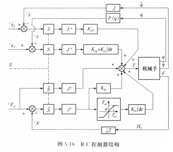 圖5-16表示R-C 控制器的結(jié)構(gòu)。圖中,S 和S 為適從選擇矩陣;xa 和Fa 為定義于笛 卡兒坐標(biāo)系的期望位置和力的軌跡;P(q) 為機(jī)械手運(yùn)動學(xué)方程;T 為力變換矩陣。