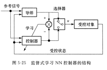 當(dāng)受控系統(tǒng)的動力學(xué)特性是未知的或僅 部分已知時,需要設(shè)法摸索系統(tǒng)的規(guī)律性, 以便對系統(tǒng)進(jìn)行有效的控制;谝(guī)則的專 家系統(tǒng)或模糊控制能夠?qū)崿F(xiàn)這種控制。監(jiān)督 (即有導(dǎo)師)學(xué)習(xí)神經(jīng)網(wǎng)絡(luò)控制(Supervised Neural Control,SNC)為另一實現(xiàn)途徑。 圖5-25表示監(jiān)督式神經(jīng)控制器的結(jié)構(gòu)。 圖中,含有一個導(dǎo)師和一個可訓(xùn)練控制器。 實現(xiàn)SNC 包括下列步驟: