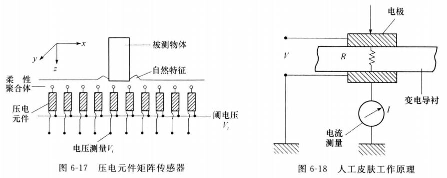 這種傳感器的壓敏元件是埋放在彈性聚合體內(nèi),見(jiàn)圖6-17。測(cè)量輸出電壓V, 就能夠獲得物體作用力形成的映像 。