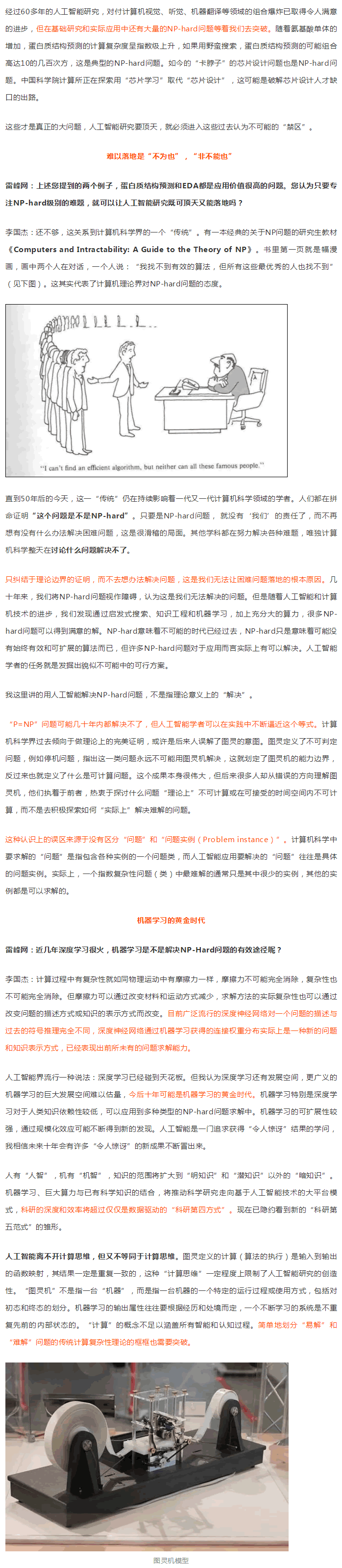 學(xué)術(shù)界的人工智能研究過分局限于約翰·麥肯錫的定義,也就是人工智能的目標(biāo)是“像人”,并指出我們應(yīng)該突破對(duì)智能的狹義理解。這與AI要解決NP-hard級(jí)別難題有什么聯(lián)系?